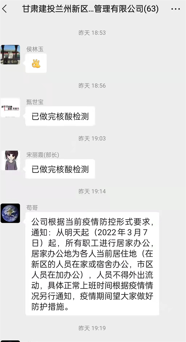 3月6日,蘭州新區(qū)出現(xiàn)5例新冠肺炎確診病例,蘭州新區(qū)立即啟動疫情防控應(yīng)急處置機制,面對突如其來的疫情,新區(qū)公司高度重視,快速行動,立即響應(yīng)蘭州新區(qū)新冠肺炎疫情防控安排部署,要求全體員工按照中川園區(qū)發(fā)布的緊急通告,向公司和社區(qū)報備個人近期活動軌跡,篩查與確診病例活動軌跡有交集的人員,做好自我健康監(jiān)測、核酸檢測,居家不外出。